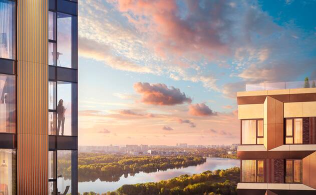 Особое внимание уделено светопрозрачности: угловое остекление в 40% квартир обеспечивает панорамные виды на Москву-реку и парковые зоны. Окна длиной от 2.1 м и высота потолков до 4.4 м в пентхаусах формируют эффект "воздушности" пространства, а бесшовные переходы между внутренними и внешними зонами достигаются через продуманную систему лоджий и террас.