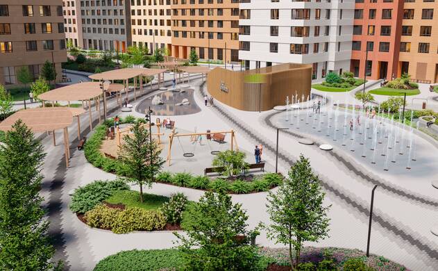 - Парк: 14 прогулочных маршрутов, сухой фонтан, спортивные зоны