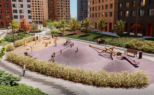 - Детская инфраструктура: 3 игровые площадки, детский центр в стилобате