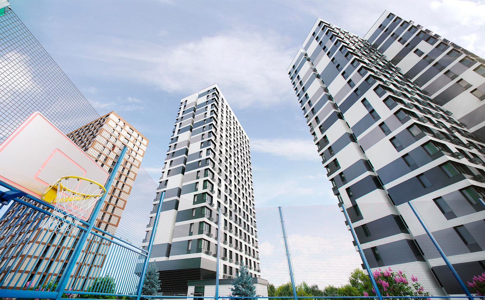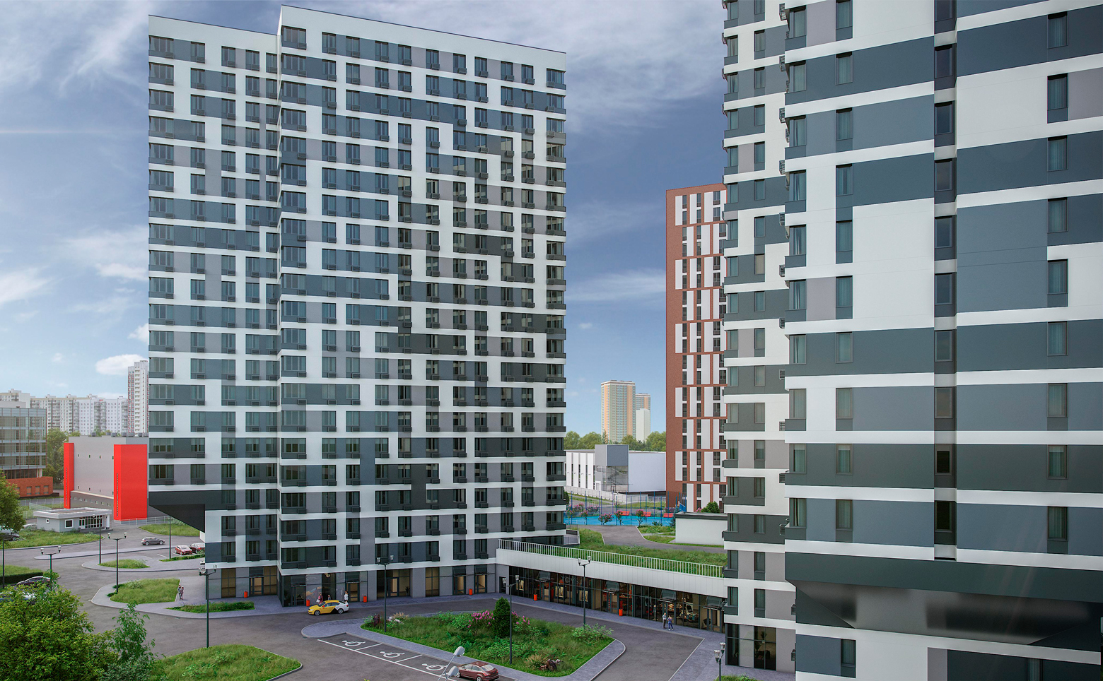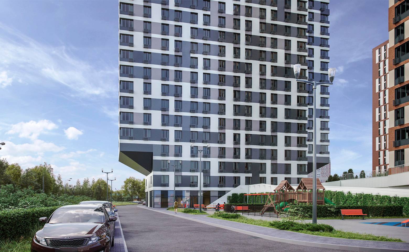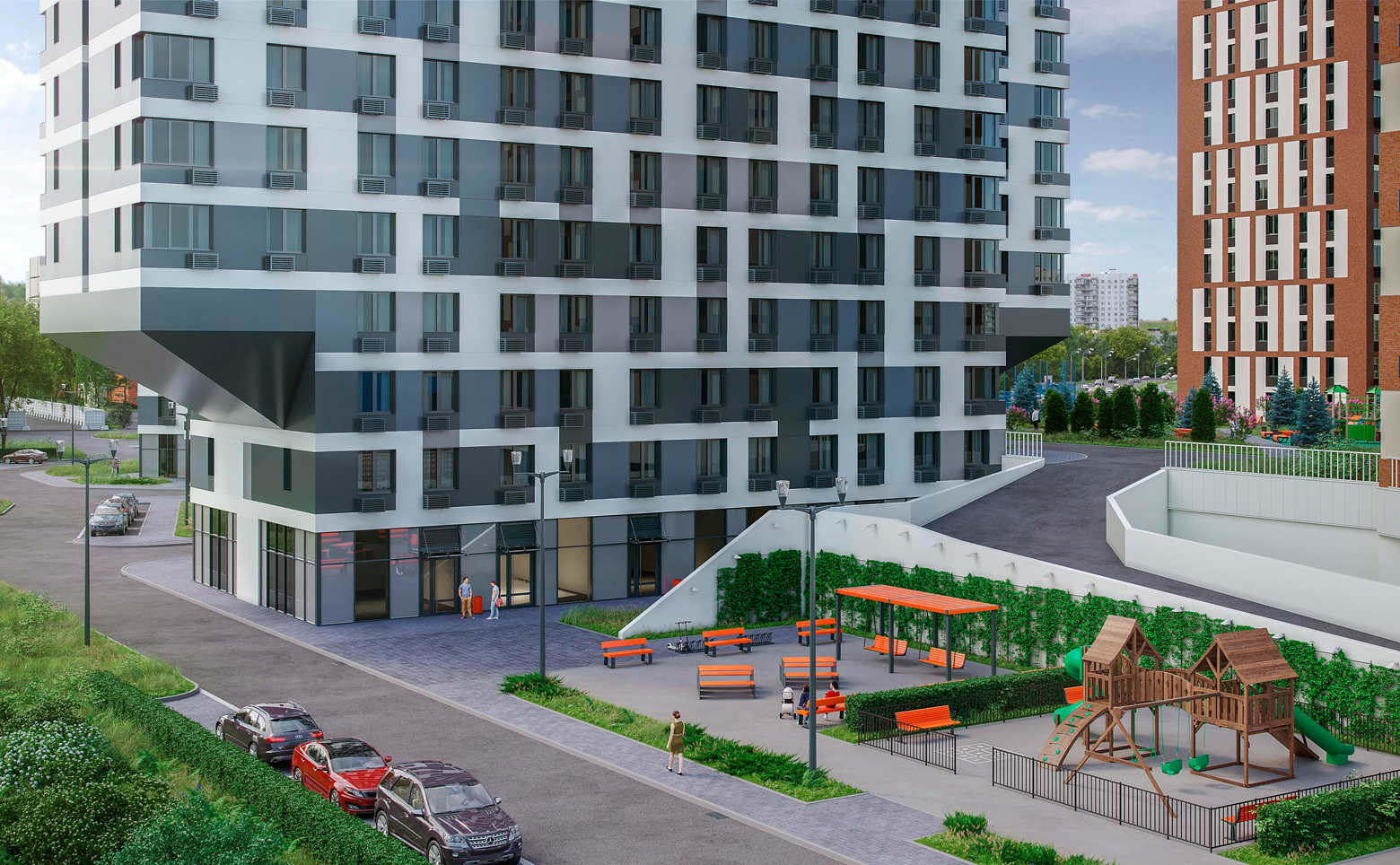 - Территория: Закрытый двор-парк на крыше стилобата с детскими и спортивными площадками