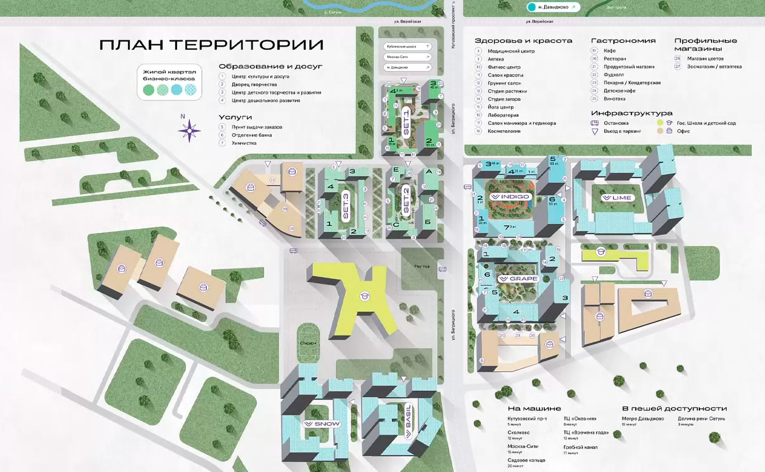 - Собственная инфраструктура: Школа на 1500 мест, детский сад на 450 мест, фитнес-клуб с бассейном, медцентр