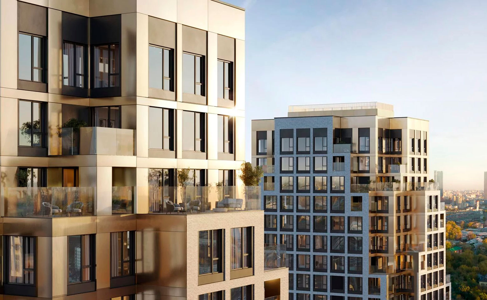 - Премиальное оснащение: Качественные материалы отделки, панорамное остекление, террасы с озеленением