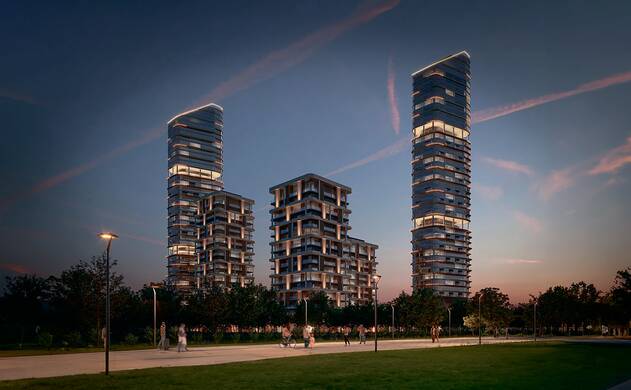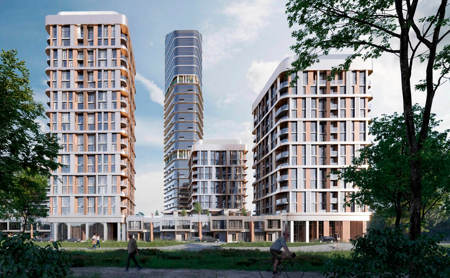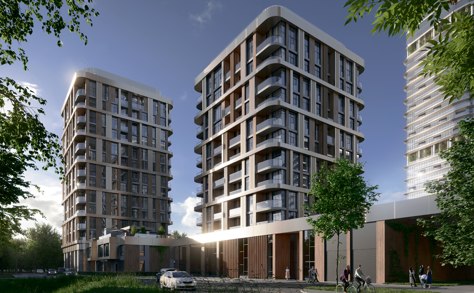Комплекс включает разноформатную недвижимость: две высотные башни (35 и 37 этажей), три клубных дома (11-19 этажей) и 15 таунхаусов с частными палисадниками. Уникальный волнообразный дизайн фасадов от бюро UNK architects вдохновлен природными формами речной глади и лесного массива.