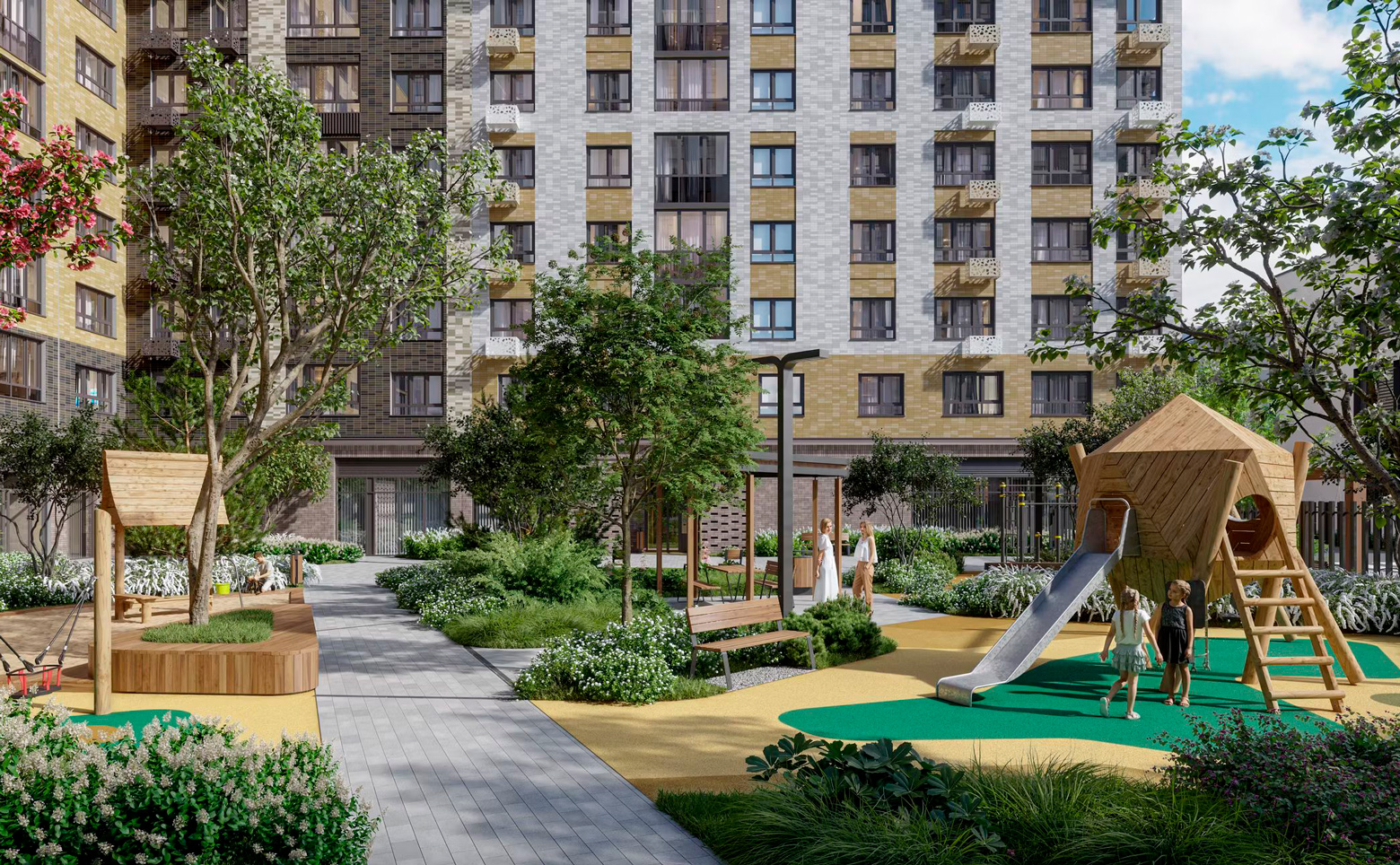 - ▸Концептуальное озеленение: На территории — «исцеляющий» сенсорный сад (30% озеленения), тематические дворы (Хвойный, Водный, Цветущий) с уникальным ландшафтным дизайном от бюро «Выси».